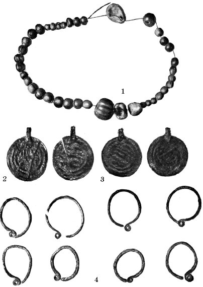 Погребальный инвентарь, обнаруженный в погребении IX–X вв. рядового горожанина. Раскопки в усадьбе Успенского собора 1913 г. Киев. 1 – стеклянные, пастовые и сердоликовые бусы; 2, 3 – подвески-диргемы; 4 – восемь височных колец с несомкнутыми концами.