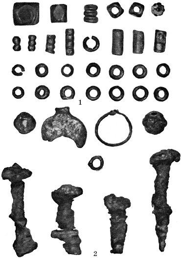 Погребальный инвентарь, обнаруженный в погребениях IX–X вв. рядовых жителей Киева. Раскопки 1937 г. в районе Художественной школы. 1 – сердоликовые, стеклянные, пастовые и серебряные бусы, серебряная лунница и височное кольцо с завязанными концами; 2 – серебряное височное колечко и железные гвозди от гробовища.
