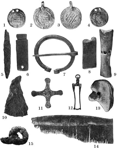 Погребальный инвентарь, обнаруженный в погребении IX–X вв. знатного мальчика. Раскопки 1909 г. в усадьбе Десятинной церкви. Киев. 1–4 – подвески-диргемы, 5 – железный ножичек, 6, 8 – миниатюрные оселки, 7 – бронзовая пряжка, 9 – костяная свистулька, 10 – миниатюрный топорик, 11 – крестообразная серебряная накладка, 12 – коромысло миниатюрных бронзовых весов, 13 – просверленная пяточная кость, 14 – костяной гребень, 15 – железное изделие.