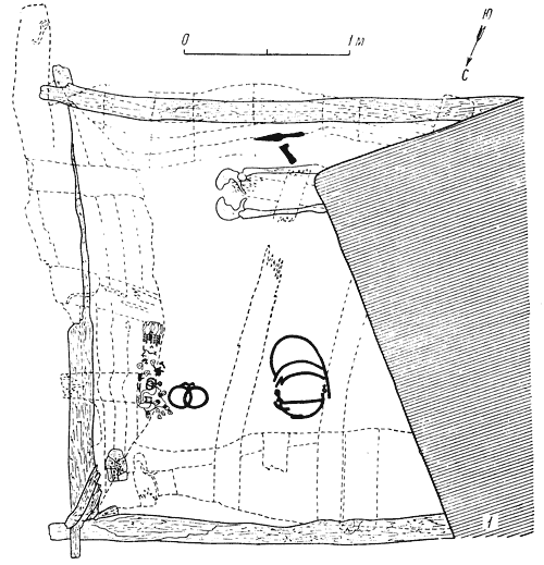 Погребение IX–X вв. знатного дружинника. Раскопки 1939 г. в усадьбе Десятинной церкви. Киев. 2 – общий вид могильный камеры.