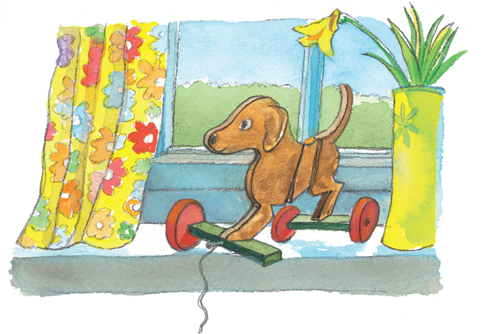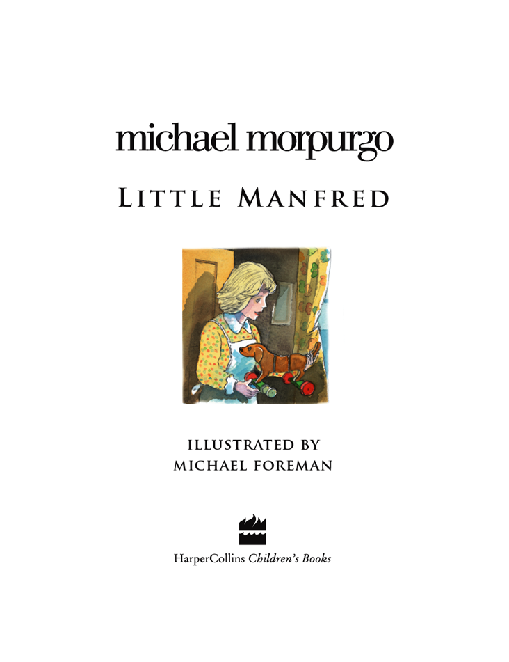 All our friends thought Manfred was a funny sort of a name for a dog. Apparently I’d called him after our toy dog, Little Manfred, a wooden dachshund, painted brown with red wheels. Mum had played with him when she was little. Then I’d had him to play with for a while, and now he belonged to Alex; only Alex wasn’t that interested in him any more, mostly because he’d grown out of him, but also because Little Manfred only had three wheels by now, and didn’t work very well. Dad had trodden on him the Christmas before, by accident of course. So Little Manfred was ‘busted’, and Alex never let Dad forget who’d done it. Dad was always saying he’d mend him, but he never did. So there Little Manfred had stood ever since Christmas, lopsided on the sitting-room windowsill, waiting for a new wheel.