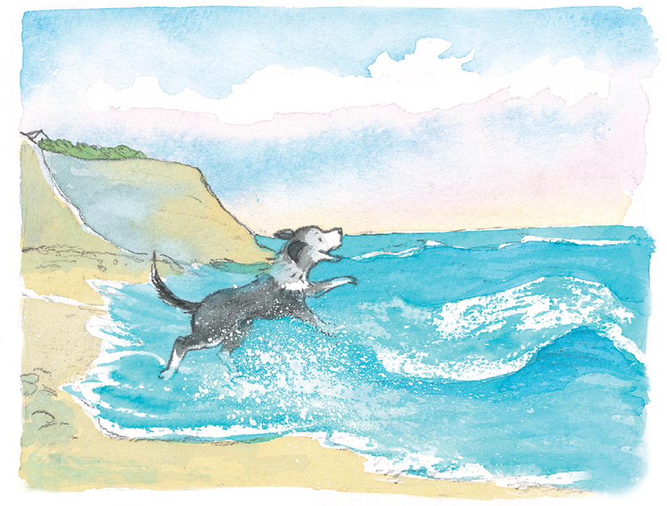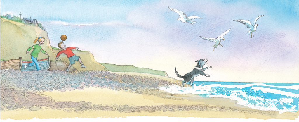 It was a wild and blustery day with clouds scudding across the sky. I sat down and watched the waves tumbling in towards the shore. Mannie was bored with football by now because Alex kept taking the ball away from him. Instead he was doing what he usually did, chasing everything that moved – his tail first, then gulls, leaves and a paper bag that was flying low across the beach, just too high for him to catch. After a while he came running back to me. I knew what he was after. And I knew too that once I started the game it would go on for ever. He stood there looking at me adoringly, his eyes pleading with me. I gave in, just as he knew I would. I picked up a stick and threw it into the sea for him. Off he went and back he came, again and again and again.