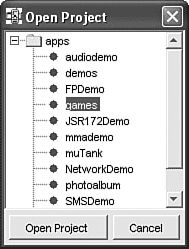 Чтобы открыть существующий проект в KToolbar, на панели инструментов щелкните по кнопке Open Project (Открыть проект). Будут отображены проекты, созданные в папке apps, расположенной в папке установки J2ME Wireless Toolkit. На рис. 2.3 показано диалоговое окно Open Project (Открыть проект), в котором вы можете выбрать проект, хранящийся в папке apps.