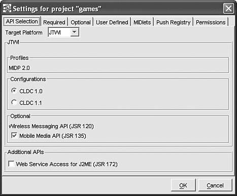 Обычно набор инструментов, предлагаемый производителями, содержит дополнительные профили устройств, которые помогут вам при эмуляции мидлетов, а также расширения API, поддерживаемые выпускаемыми устройствами. Хотя зачастую эти API очень мощны, я советую использовать стандартные MIDP API, чтобы создаваемые вами игры можно было без проблем распространять между мобильными телефонами.