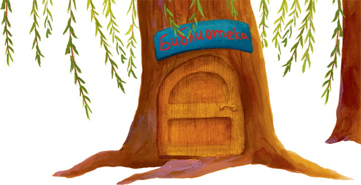 Взглядам путешественников открылась огромная ива. Под свисающими ветвями древнего дерева друзья увидели старинную дверь, над которой красовалась вывеска «Библиотека».