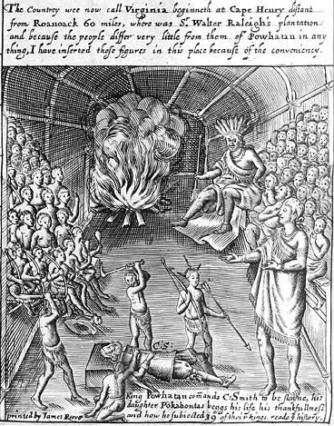 Покахонтас спасает капитана Смита от неминуемой смерти. Гравюра из «Общей истории Виргинии, Новой Англии и островов Сомерса» Джона Смита. Лондон, 1624