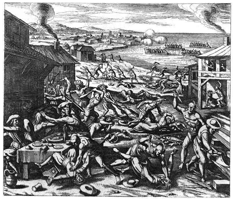 Нападение индейцев в 1622 году на английских колонистов в Джеймстауне (Виргиния). Гравюра. 1655