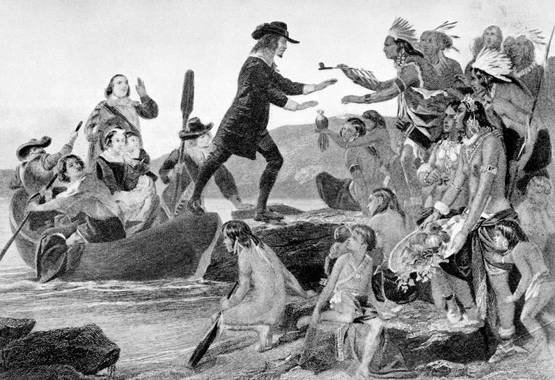 Высадка Роджера Уильямса на Род-Айленде в 1636 году. Литография 1913 года с картины Алонзо Чаппела 1857 года