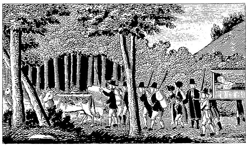Колонизация Коннектикута. Томас Хукер и его люди в лесах Коннектикута. Гравюра. Конец XVII века
