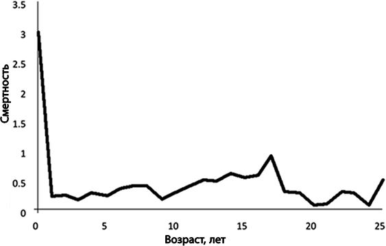 Рис. 1. Смертность особей голого землекопа в лабораторных условиях, по данным Рошель Баффенштайн