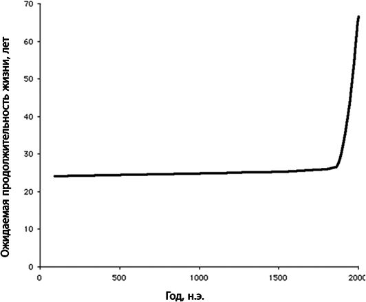 Среди охотников-собирателей в верхнем палеолите продолжительность жизни была примерно 32 года, а в неолите – всего 20 лет. Тем не менее ожидаемая продолжительность жизни человека заметно выросла за последнее столетие и продолжает увеличиваться (рис. 4). Согласно данным ЦРУ за 2014 год, в целом средняя продолжительность человеческой жизни в настоящее время составляет 68 лет и колеблется от 49 (в Чаде) до 89–90 (в Монако и Японии) лет. Резкий скачок в долголетии вызван хлорированием воды, распространением личной гигиены, улучшением качества питания, снижением детской смертности, появлением вакцинации, антибиотиков и других лекарств.