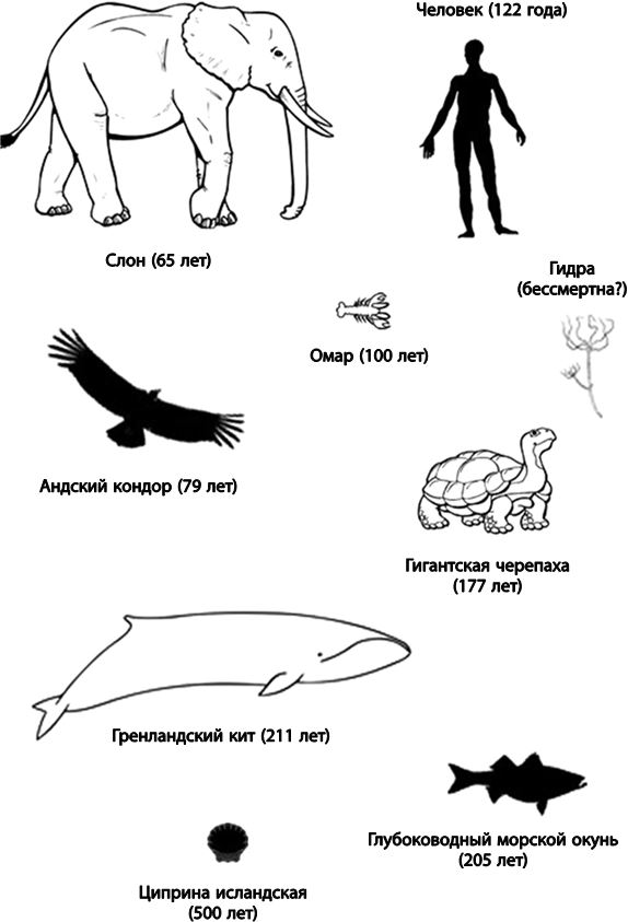 В отличие от старения многих других видов живых существ, старение человека протекает постепенно. Максимальная продолжительность жизни человека уже сейчас не укладывается в известные эволюционные правила. Существует взаимосвязь между массой тела позвоночных животных и максимальной продолжительностью жизни вида. Чем крупнее животное, тем дольше оно живет. Это связано с большей продолжительностью индивидуального развития, а также с тем, что более крупные животные могут лучше выносить нехватку пищи и воды, лучше защищены от нападения хищников. Для своих размеров тела человек – чрезвычайно долгоживущий вид млекопитающих. Мы живем даже дольше массивных слонов (рис. 5).