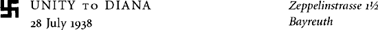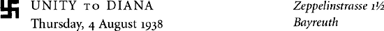 Last night the Führer was talking about which of us was going to the Parteitag, and he says he specially wants you to go. Isn’t it wonderful. I told what a marvellous rider you are and he thinks you are so beautiful and wants you to see the Parteitag while you are young. So of course I said you would be thrilled and he arranged it all, on the spot. Isn’t he kind and sweet. He talked a lot about Farve and his speech1 and said he should thank him very specially when he sees him at Nürnberg.