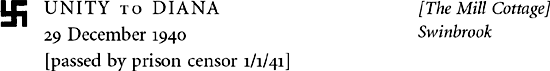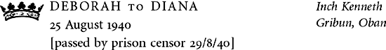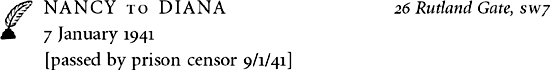I am asking permission to send you this letter instead of the visit – I did not send a pass because there have been so many air raid warnings and I thought it would be so awful if you came all the way here and then there was a warning and you could not see me after all. I am sending you a pass in this letter; but please don’t come unless you more or less must come to London – don’t come on my account because I know it must be such a trouble. Will you thank Muv millions of times for her visit and for bringing Jonathan with her, I did love seeing him, it has made such a difference. How I wish Desmond could come, but I suppose he is not strong enough yet.1 Please thank Nanny for her sweet letter; Kit always asks all details about Stodge and Weedom2 and we both long to see them, do ask her to write again soon, and do tell Miss Gillies she can write to me now (’tho I can’t reply) about Desmond. Will you ask Muv to send £1 to Desmond from me for his birthday; I am also getting Harrods to send him a few little things.
