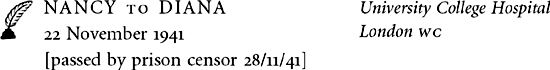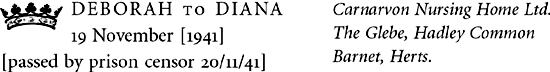 It was heaven of you to write your precious letter and all. You can’t think how much better I feel now, really quite alright.1 The comfort of this place is unbelievable and blissful nurses. It is so odd I’d never even had a bedpan before. Oh Honks, never Gilliat again, I have completely lost confidence in him. He never turned up till ages after he was wanted and when I was lying there with everything over he came in and all the nurses said ‘Here’s a friend to see you’ and if I’d had the strength I really would have kicked him or at least asked him where he had been all the afternoon.2 What was rather awful was that I’d had a temperature of 103 for four days beforehand so I really wasn’t feeling like an effort. However all one can say is that it can’t have been one quarter so bad for me as it was for Decca because I never knew the baby though it was so alive when it was born that I felt a sort of glimmer of hope though I knew it wasn’t any good. Muv was quite wonderful and Andrew stayed with me till it was nearly born, it was so wonderful to have him. He finishes his leave tomorrow which is terribly sad because he has been here such a lot this week. My duch3 and everyone have been absolutely wonderful.