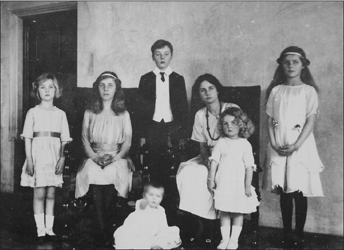 The Mitford children in 1921: Unity, Pamela, Deborah, Tom, Nancy, Jessica and Diana.