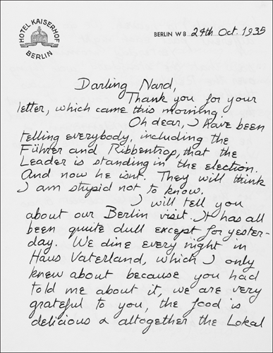 Unity spent her first months in Munich lodging with Baroness Laroche, an elderly lady who ran a finishing school for young English girls; she then lodged in a students’ hostel and a succession of flats before moving, in June 1939, into accommodation in Agnesstrasse found for her by Hitler and belonging, she wrote insouciantly to Diana, ‘to a young Jewish couple who are going abroad’. All the other members of the Mitford family, except Nancy, eventually made their way out to Germany. The Redesdales, who had initially disapproved of Nazism, were eventually won round to Unity’s point of view – permanently so in the case of Lady Redesdale.
