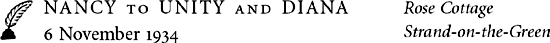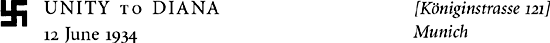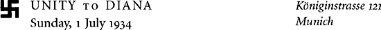 Diana’s closest confidante in the family during this period was Unity and they wrote to each other regularly during the pre-war years. Their correspondence, especially Unity’s, forms the bulk of surviving letters from the late 1930s. Incongruously written in the gushing tones of breathless excitement normally reserved for romantic fiction, the two sisters’ letters about Nazi Germany unavoidably dominate this section.