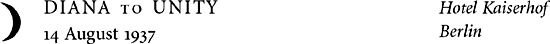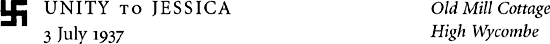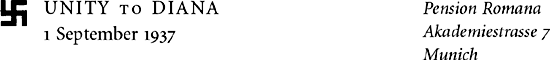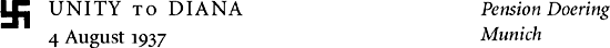 Clementine [Mitford] & I went with the Führer to Bayreuth for the festival, we were there ten days, it was lovely. Kukuli von Arent1 was in Bayreuth, & she hadn’t heard about you, she was perfectly amazed when I told her & kept on saying ‘Aber die Decca war doch so nett! Sie war doch so lustig und reizend!2 Do you remember when the two SS men here called you ‘die lustige Kommunistin’? Clementine went to England from Bayreuth, & I returned here. I have seen the Führer a lot lately which has been heaven, only now he has gone back to his mountain for a bit.