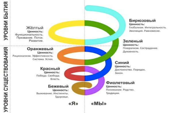 Это теория, которая описывает динамику развития личности и организаций. Она предлагает восемь уровней развития, от красного (базового выживания) до бирюзового (целостного сознания).