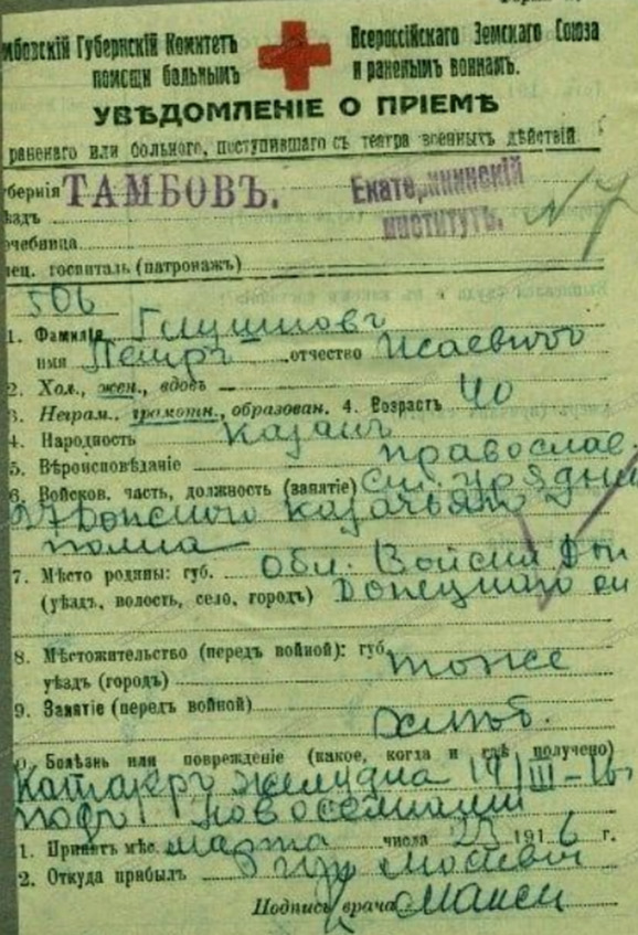 Уведомление о приёме раненого с театра военных действий Первой мировой войны, в графе народность указано – Казак