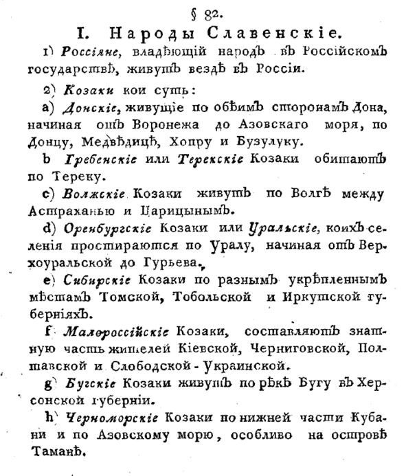 В этих книгах в отделе «Племена народов, обитающих в Российских владениях» указано, что к «славянскому племени» принадлежат: а) Русские, господствующий народ в империи; б) Казаки Донские, Черноморские, Уральские и Сибирские; в) Поляки, господствующий народ в царстве Польском и в губерниях, от Польши присоединённых»31.