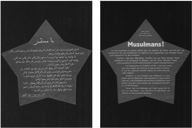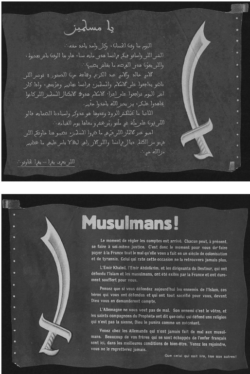 Ислам, антиколониализм и битва за ФранциюСреди первых мусульман, подвергшихся в годы Второй мировой войны немецкой пропагандистской обработке, оказались солдаты из колоний, сражавшиеся во французской армии в битве за Францию386. Используя брошюры и громкоговорители, немцы призывали мусульманские части перейти на их сторону. Большая часть этой пропаганды основывалась на религиозной риторике, лозунгах и образах. Например, в начале 1940 года армейские пропагандисты сбрасывали за линией фронта листовки, напечатанные зеленой краской (цвет пророка Мухаммада) и написанные на французском и арабском языках. Адресатом этих посланий были «мусульмане» из Северной Африки387. Чтобы «достучаться» до простых солдат, арабский текст листовок печатали не на литературном языке, а на дариже (магрибский диалект арабского). Одна из листовок, выполненная в форме флага и украшенная изображением серебряной сабли, убеждала правоверных не защищать «врагов ислама» и призывала их дезертировать: «Переходите к немцам, они никогда не причиняли вреда мусульманам» (фото 3.1). Другая листовка, примерно с тем же сообщением, гласила: «Настоящий мусульманин никогда не сражается за врагов ислама, которые захватили твои мечети и превратили их в церкви, а сегодня посылают тебя умирать, чтобы спасти жизнь христиан» (фото 3.2). Обе листовки заставляли вспомнить недавнее прошлое антиколониального сопротивления в Северной Африке, отсылая к джихаду Абд аль-Карима в марокканском Рифе, лидеру алжирского сопротивления Халиду ибн Хашиму (Амиру Халиду), внуку Абд аль-Кадира, и антиколониальному движению в Тунисе. В вермахте и министерстве иностранных дел спорадические дискуссии о пропаганде для мусульманских солдат во французских войсках и о продвижении Третьего рейха в качестве «друга магометан» начались в конце 1939 года388. Одним из первых было выдвинуто предложение изготовить небольшие амулеты в форме «руки Фатимы» (хамса)389.