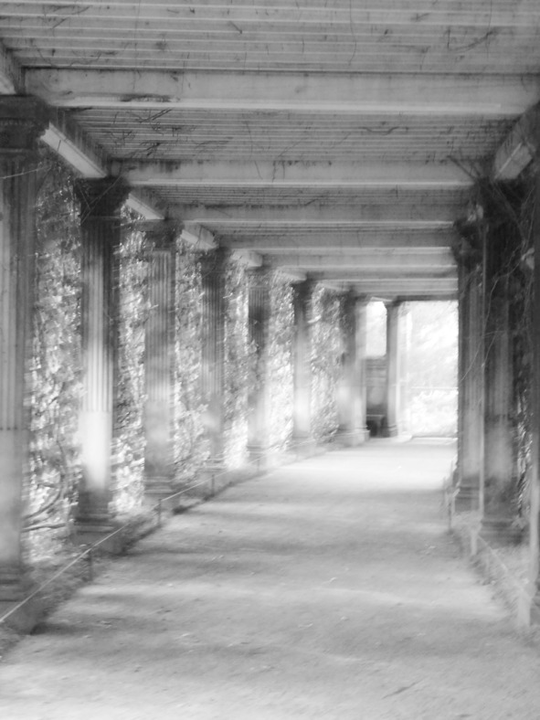 «Ладно, пусть он несётся подо мной», – спокойно решила она и в этот момент обнаружила себя стоящей в тени чугунной перголы, настолько увитой диким виноградом, что сквозь него не пробивался ни один лучик заходящего солнца. Было достаточно жарко, несмотря на тень от листвы, и явно клонившийся к концу летний день. Чугунные прутья перголы были выполнены в виде больших лир, соединявшихся вверху своими завитками, и это придавало всей конструкции дополнительную ажурность и лёгкую прозрачность. Внутри неё прямоугольными каменными плитами была вымощена дорожка, уходившая далеко вперёд и заканчивавшаяся мягким поворотом.