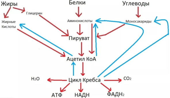 Особенностью цикла Кребса является то, что он совмещает в себе процессы катаболизма и анаболизма, т. е. он и разрушает, и создает. Так, некоторые продукты цикла Кребса способны частично участвовать в создании новых веществ, например в производстве глюкозы из веществ, не являющихся углеводами. Итак: