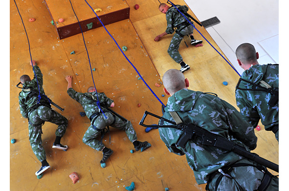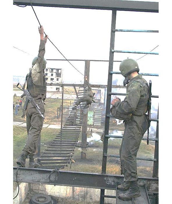 Кроме полосы препятствий, учебный центр (лагерь) должен иметь специально оборудованный участок альпинистской подготовки и скалодром, специально подготовленные для обучения наведению переправ, верёвочных мостов, скалолазанию, подъёму и спуску по верёвке с помощью альпинистского снаряжения, а также свободному спуску скольжением на руках по канату и десантированию с вертолётов (фото 9, 10).