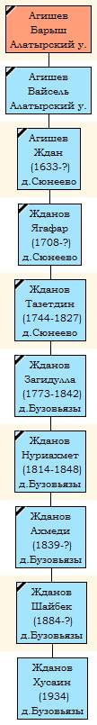 5/2. Ждан Вайселев (Васильев) сын Агишев (Барышев) (1633–?). Уроженец Алатырского уезда. С 1640-х годов житель деревни Секияды Осинской дороги Уфимского уезда.