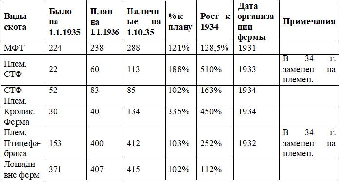 При МТФ имеется 2-годовалые чистопородные бараны – производители породы «Прекос», завезенные в 1935 году из Азово-черноморского края. При СТФ имеется 3 головы чистопородных хряков – производителей красно-белой английской породы. Кроме того, в 1935 с будет продаваться колхозам нашего района 60 голов племенных поросят, 100 голов племенных петухов породы «белые Ленгорны» и 40 голов кроликов венской голубой породы.