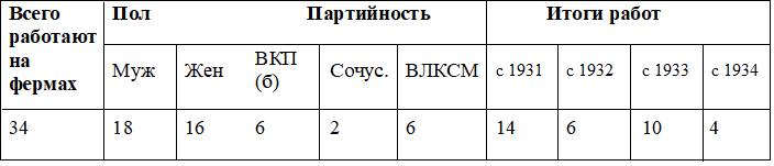 Выдвинуто на руководящую работу 13 чел. – работают в с/советах, кооперации и учительстве. Из 9 работающих бригадиров со стажем с 32 г. – 5 чел., с 34 г. – 3 чел., с 35 г. – 1 чел., из них членов ВКП (б) – 3 чел., кандидатов ВКП (б) – 2 чел., членов ВЛКСМ – 1 чел., беспартийных – 3 чел.