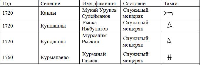 Помимо приведенных выше названий, известны также тамги «чумэлэ» («копна»), «куз-тамга» («глаз»), «кайчы» («ножницы»), «чумеч» («ковш»), «тырма» («грабли»), «ачкыч» («ключ») и другие подобные. Тамга одного из родоначальников династии Сулеймановых Мукая Урукова, по материалам переписи 1720 года, видимо, называется «килэп агачы», то есть «сновальня» (деревянный предмет, используемый при прядении, изготовке валенок). Такая же примерно тамга была у православной ветви Тимашевых (крещеные татары)169. Тимашевы известны как служилые татары, князья. Проживали в Темниковском и Кадомском уездах. В XIX веке переселились и в наши края – в деревни Старое Калмашево (ныне Чекмагушевский район) и Мустаево Стерлитамакского.