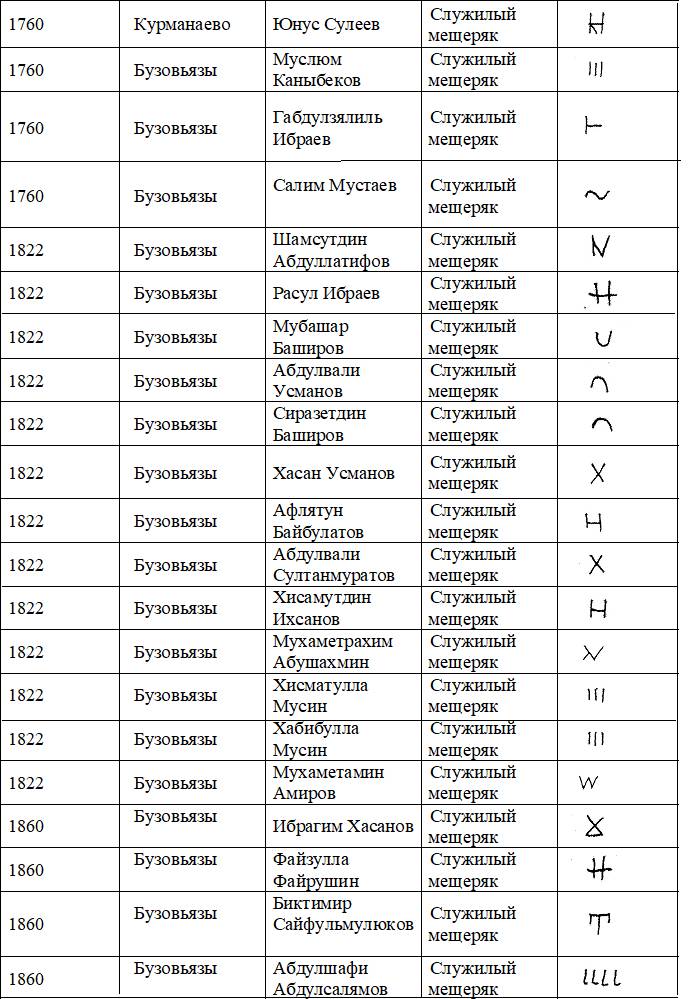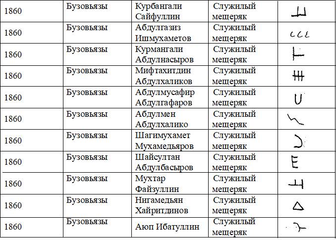 В архивных источниках было собрано немало бузовьязовских тамг, которые показаны в нижеследующей таблице: