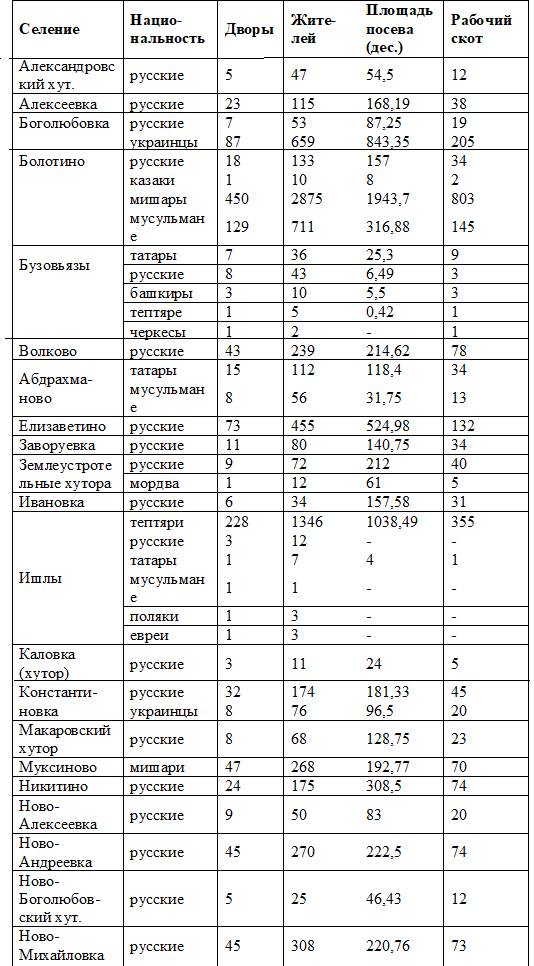 : д. Алексеевка (45 муж., 61 жен.; 106 чел.), п. Девшеяровка (61 муж., 87 жен.; 148 чел.), п. Кызыл-Тан (46 муж, 50 жен.; 96 чел.), п. Летенко (47 муж., 57 жен.; 104 чел.), Мельница №1 (16 муж., 13 жен.; 29 чел.), д. Надеждино (72 муж., 81 жен.; 153 чел.), д. Никитино (106 муж., 125 жен.; 231 чел.), д. Семеновка (67 муж., 65 жен.; 132 чел.), д. Старо-Янбеково (86 муж., 96 жен.; 192 чел.), д. Субхангулово (150 муж., 160 жен.; 310 чел.), д. Сулеймановка (77 муж., 80 жен.; 157 чел.), д. Чишма (78 муж., 89 жен.; 167 чел.), д. Чулпан (91 муж., 93 жен.; 184 чел.), Хутор Хасаново (45 муж., 49 жен.; 94 чел.), д. Яковлевка (59 муж., 61 жен.; 120 чел.).