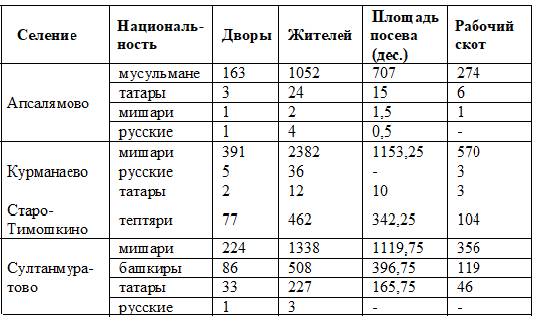 Курманаевский сельсовет: д. Курманаево (886 муж., 890 жен.; 1776 чел.), Хутор Лукьянчиково (11 муж., 18 жен.; 29 чел.), Мельница №2 (8 муж., 6 жен.; 14 чел.), Мельница №3 (6 муж., 6 жен.; 12 чел.), Мельница колхоза «Янги Юл» (2 муж., 3 жен.; 5 чел.), д. Старо-Тимошкино (178 муж., 232 жен.; 410 чел.), д. Тюбяково (187 муж., 223 жен.; 410 чел.);