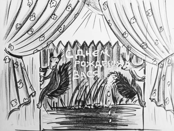 Во дворе его небольшого частного дома расположились две большие рыжие белки. Одна, развалившись на крылечке, попивала прямо из горла литрушечку водки, а вторая выводила на заборе: «С Днем рождения, Вася!», макая свой хвост в банку с краской.