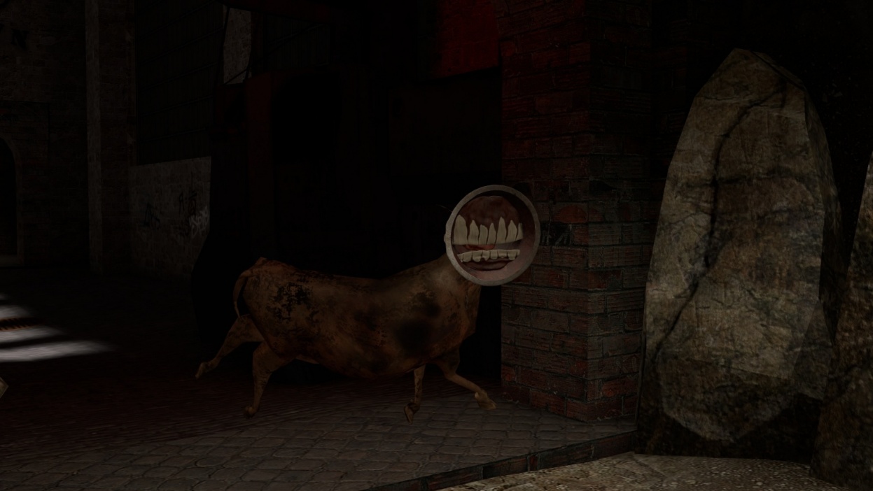 Вокруг резко стало темно, и только вдали я увидел тусклый свет. Что происходит, чёрт возьми?! Если это сон, то как проснуться? Мне страшно! Подойдя ближе к свету, я понял, что это канализация. Даже не просто канализация, а целый лабиринт с ужасно смердящем запахом. Приглядевшись, я обнаружил небольшую комнату, над которой горела красная лампочка. В этой комнате было около десяти различных вентилей. Я начал раскручивать их, и, закончив с последним, вдруг раздался скрежет, а лампочка загорелась зеленым. Что это был за скрежет? Может я открыл какой-то проход? Только я решил выйти обратно, как увидел, что по каналу движется нечто ужасное, это был монстр с огромными зубами и телом коровы. Повезло, что он не заметил меня. Немного подождав, я бросился наутёк, куда глаза глядят. И увидел наверху люк, из которого спускалась металлическая лестница. Вот, что это был за скрежет.