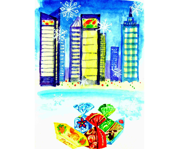 В том краю пушистые ёлки и разноцветные фонарики. По улицам ходит бородатый дедушка с большим красным мешком, а в мешке красивые игрушки, золочёные орехи, ароматные мандарины и шоколадные батончики. Повсюду весёлые зрители, звонкие аплодисменты, холодный синий лёд и целые сугробы снега.