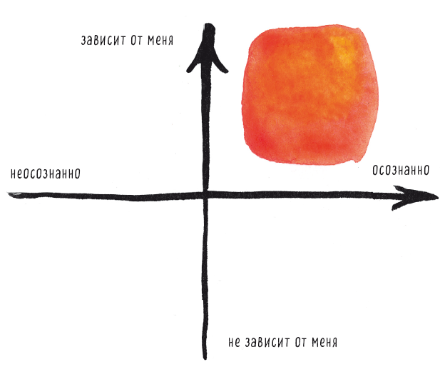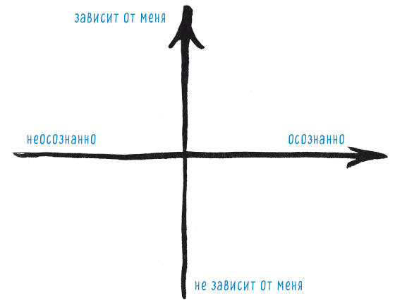 Система координат будет состоять из двух осей: ось X и ось Y. Ось X – горизонтальная ось «осознанно-неосознанно». Ось Y – вертикальная, это ось «зависит от меня – не зависит от меня». Таким образом у нас получаются четыре квадранта (да простят меня те, у кого аллергия на математику!). Увидев эти четыре квадранта, участники тренингов сразу же заполняют их своими примерами, давая им логичные названия.