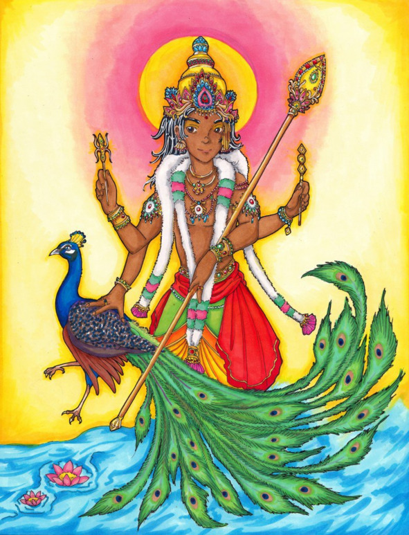 Я поклоняюсь Шри Картикейе, восседающему на павлине, кому ведома тайна Маха-Вакья, у кого очаровательное тело, пребывающему в умах великих людей, Богу неба и земли, сути великих Вед, сыну Махадева, правителю мира.