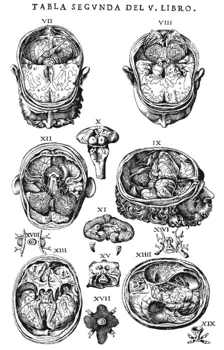 Сложные рисунки, выполненные Везалием за последующее десятилетие, изменили представление об анатомии человека5. Иногда он проводил диссекцию мозга на срезы в горизонтальной плоскости, как срезают верхушку с дыни, и делал такие же изображения, какие получают теперь при помощи современной компьютерной аксиальной томографии. На других иллюстрациях он накладывал на мышцы кровеносные сосуды или открывал в мышцах “окошки”, чтобы было видно, что находится в более глубоких слоях.