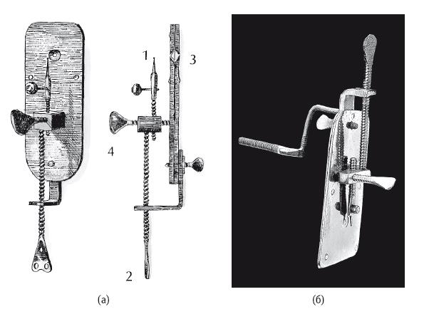 (а) Схема одного из первых микроскопов Левенгука: 1) предметная игла, 2) основной винт, з) линза, 4) рукоятка для фокусировки.