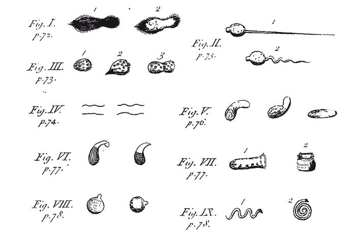 Некоторые виды “анималькулей”, обнаруженных Левенгуком с помощью простого микроскопа. Заметим, что Fig. II в нижней части рисунка может быть изображением либо человеческого сперматозоида, либо жгутиковой бактерии.