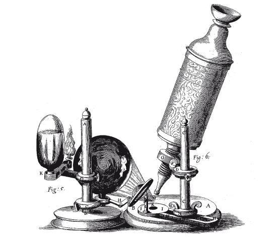 Изображение сложного двухлинзового микроскопа, которым пользовался Роберт Гук. Обратите внимание на латунную трубку, в которой установлены две линзы, на пламя с несколькими зеркалами в качестве постоянного источника света и размещенный под трубкой образец.