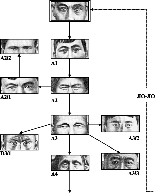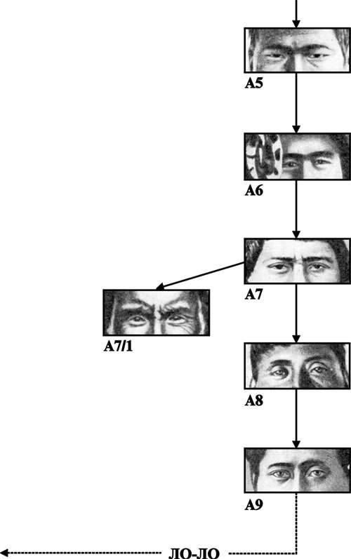 Причем от основной линии изменчивости глаз отходят несколько ответвлений: от урало-алтайской расы – лапоноидная и балтийская расы (одна за другой по принципу изменчивости глаз), от южно-сибирской расы – центрально-азиатская, эскимосская и маньчжуро-корейская расы (отдельно друг от друга) и от патагонской расы – тихоокеанская раса.