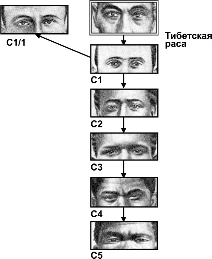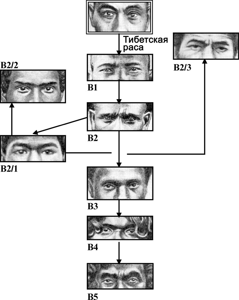 По степени математического приближения глаз в этот путь после тибетской расы вошли следующие расы: памирская, эфиопская, негрская, африкано-пигмеоидная и бушменская. От памирской расы имеется одно ответвление – северо-кавказская раса.