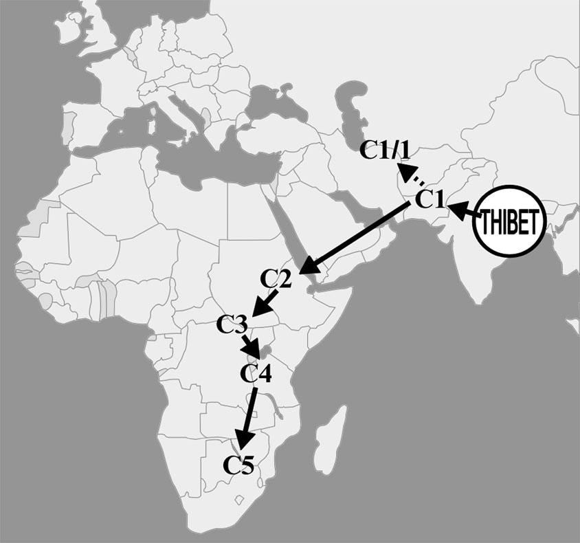 Это черная ветвь миграции человечества из Тибета. У нас получилось, что прародителем черных рас (эфиопская, негрская, африкано-пигмеоидная и бушменская) является памирская раса, которая в настоящее время представлена, как мне думается, таджиками и другими народами Памира. От той же памирской расы произошла северо-кавказская раса, представленная в современности многочисленными кавказскими народами.