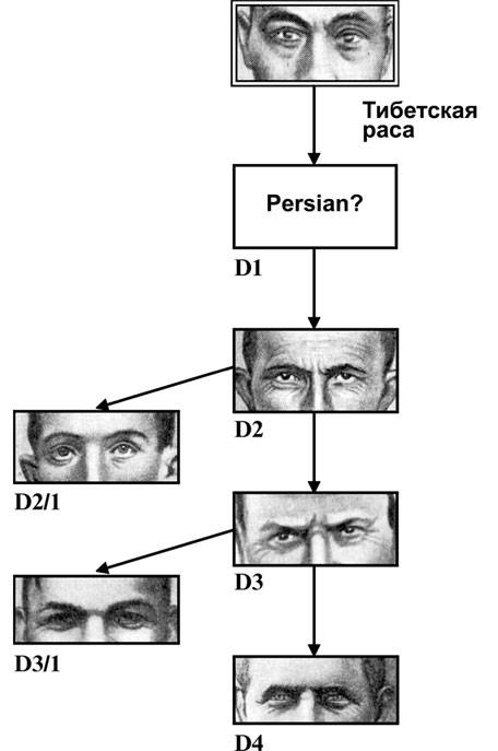 Но по системе математического приближения глаз тибетская раса в этом пути миграции отстоит от арменоидной расы дальше, чем в предыдущих путях миграции от соседствующих рас – палеосибирской, южно-азиатской и памирской. Поэтому мы предположили, что между тибетской и арменоидной расами должна быть еще одна раса, не учтенная в классификации А. Ярхо. Какая же это раса?